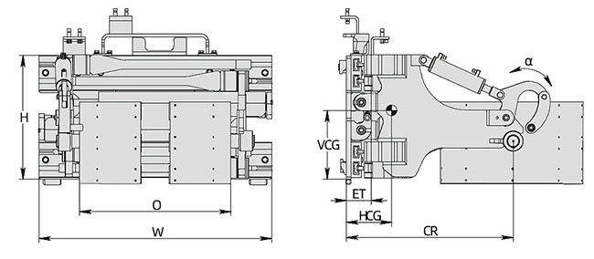 Центр тяжести, мм | Класс каретки | Диапазон раскрытия O, мм | Высота каретки H, мм | Ширина каретки W, мм | Расстояние до оси вращения CR, мм | Угол вращения вперед α | Вес, кг | Толщина ЕТ, мм | Вертика- льный центр тяж. VCG, мм |